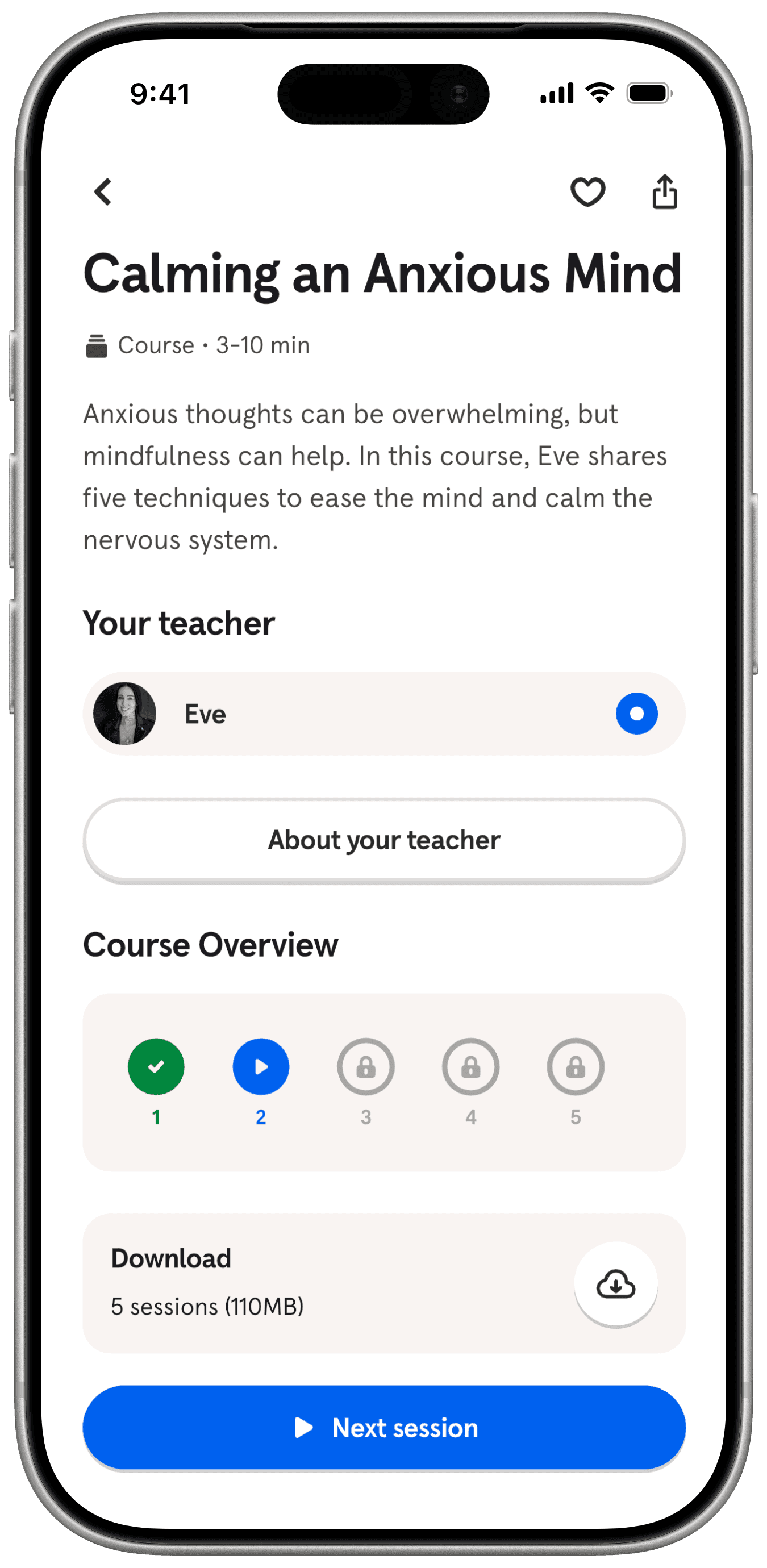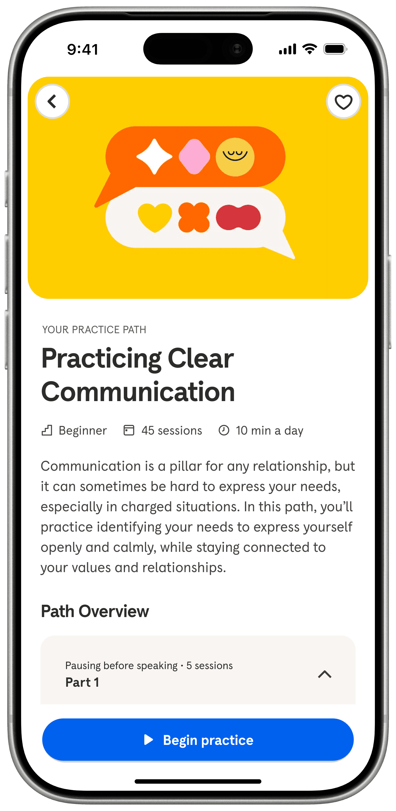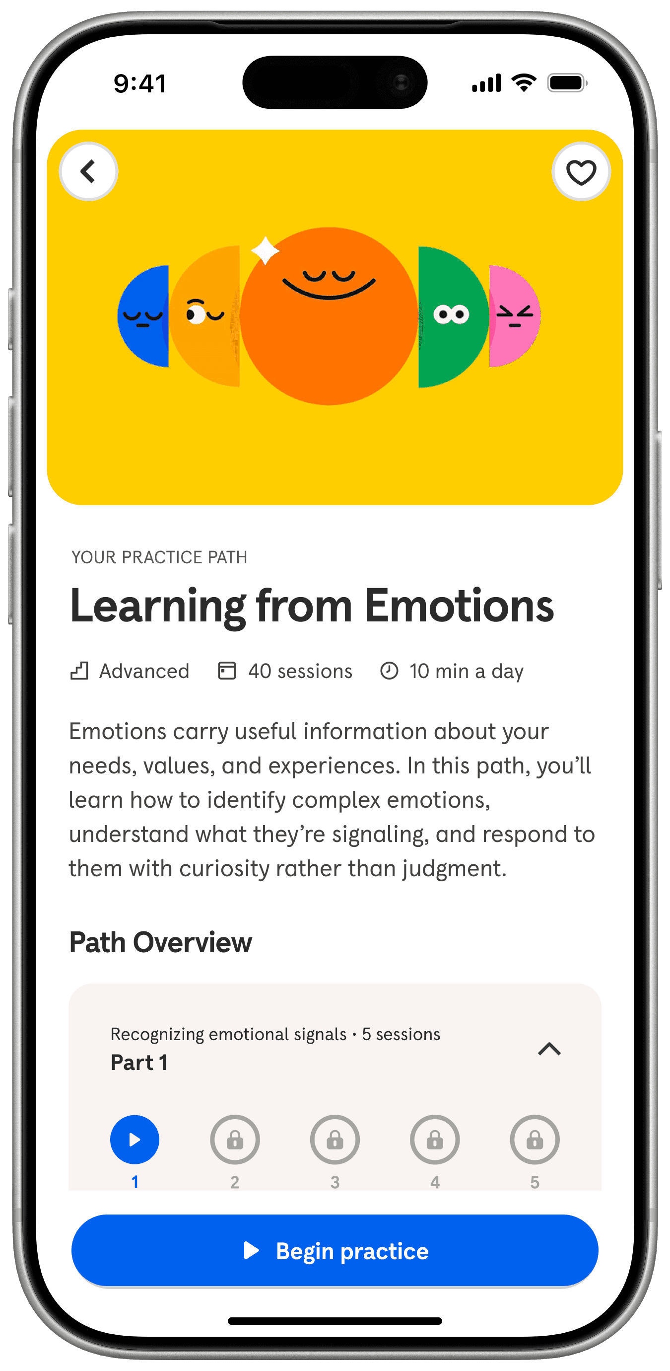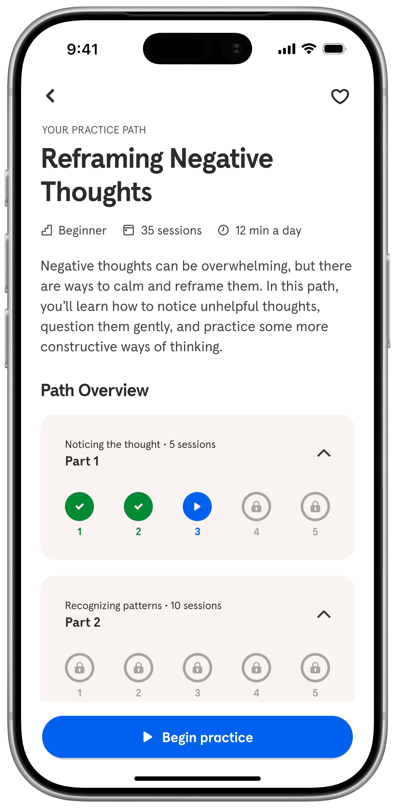 Practice Path builds on Headspace’s structured course overview, adapting the familiar format to guide members through skill-building lessons and track their progress.