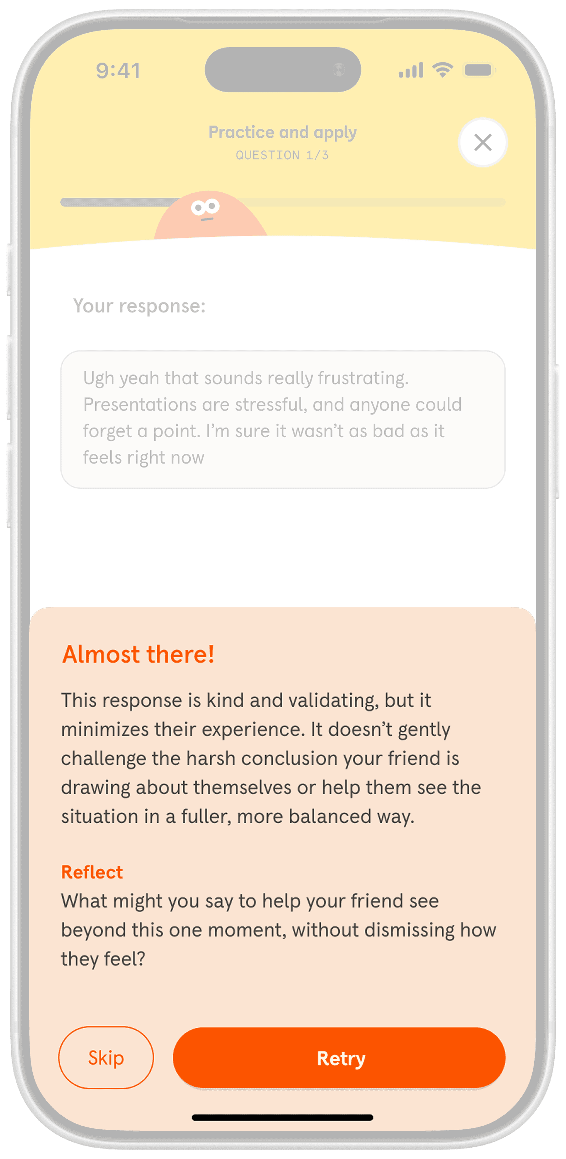 Feedback and prompts are supportive and growth-oriented, avoiding language that feels corrective or evaluative