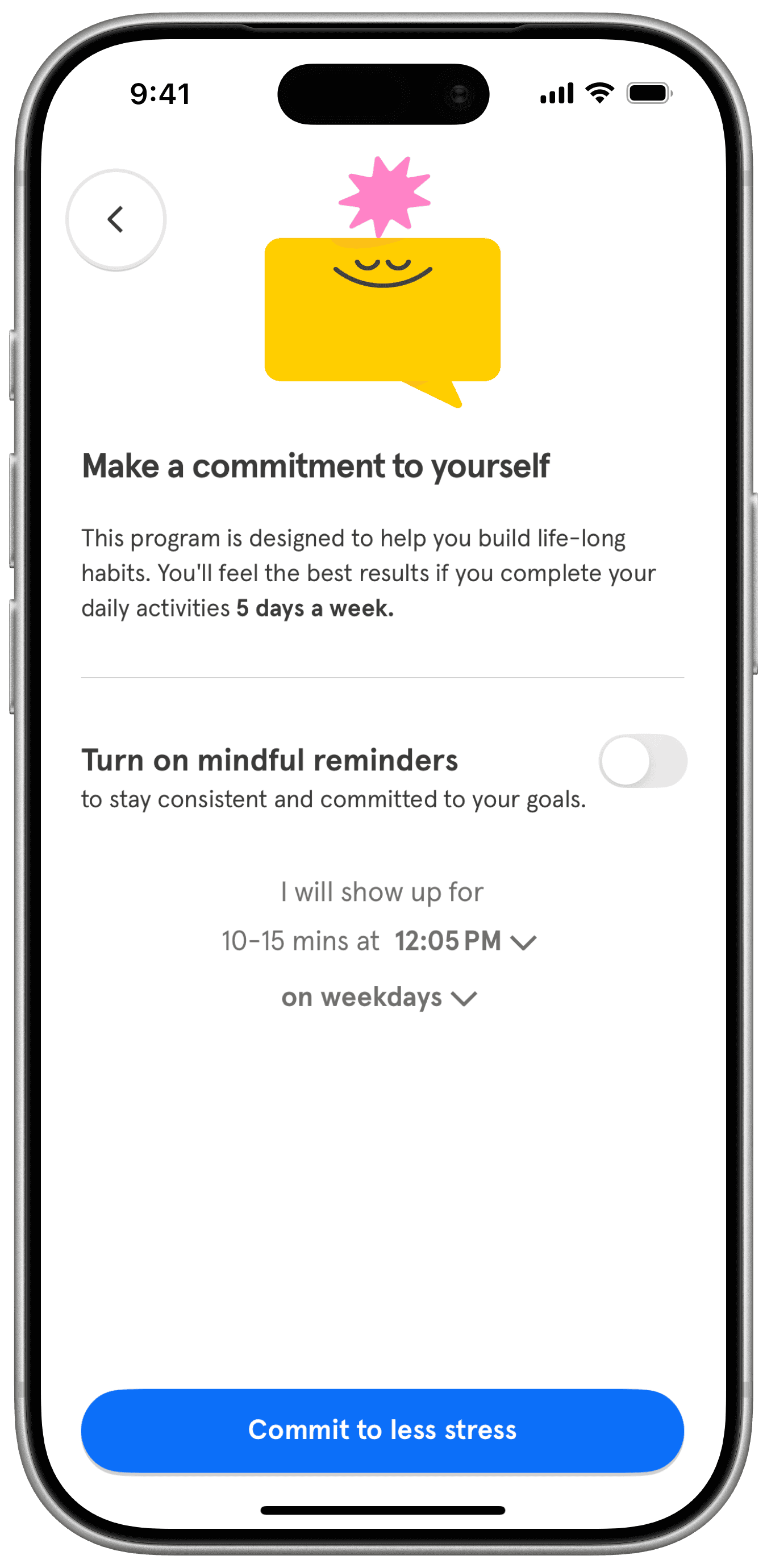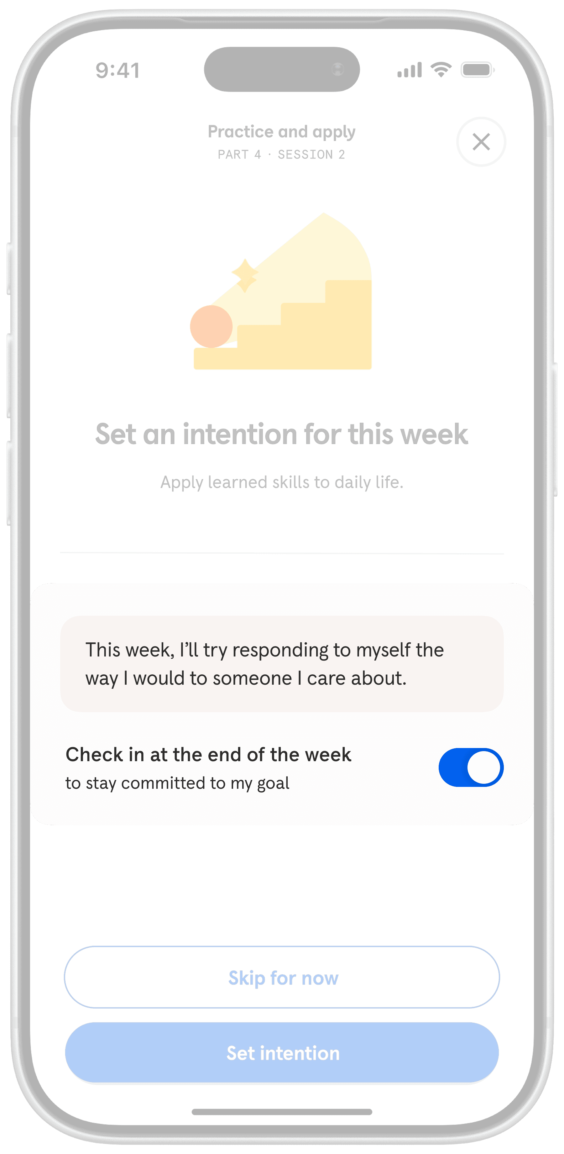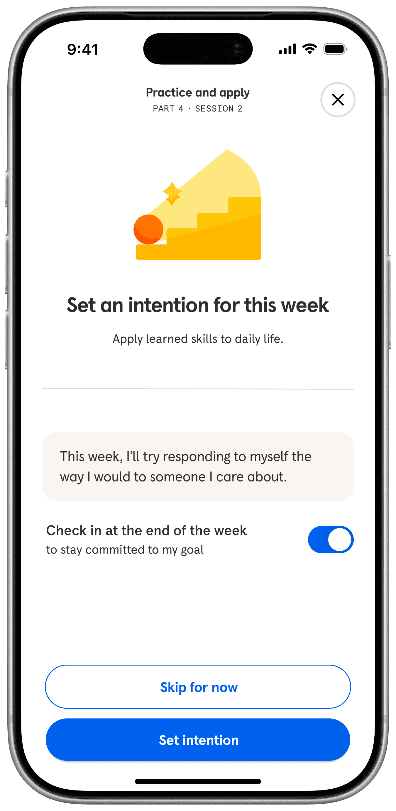 Headspace encourages habit-building through daily reminders to return to the app. Practice Path extends this by prompting members to set small intentions to apply newly practiced skills in real-life situations.