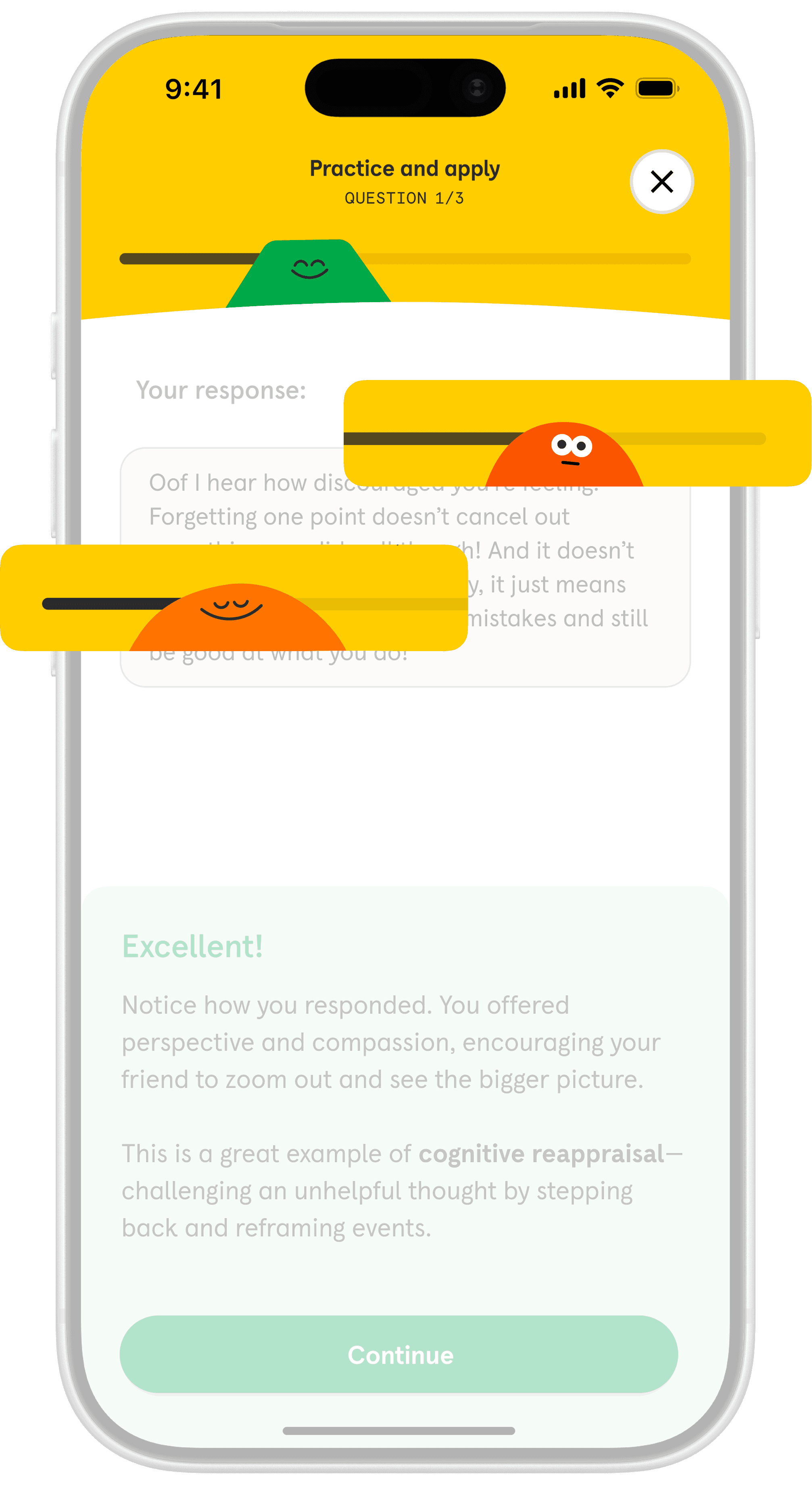 Cognitive reframing is introduced through familiar relational contexts